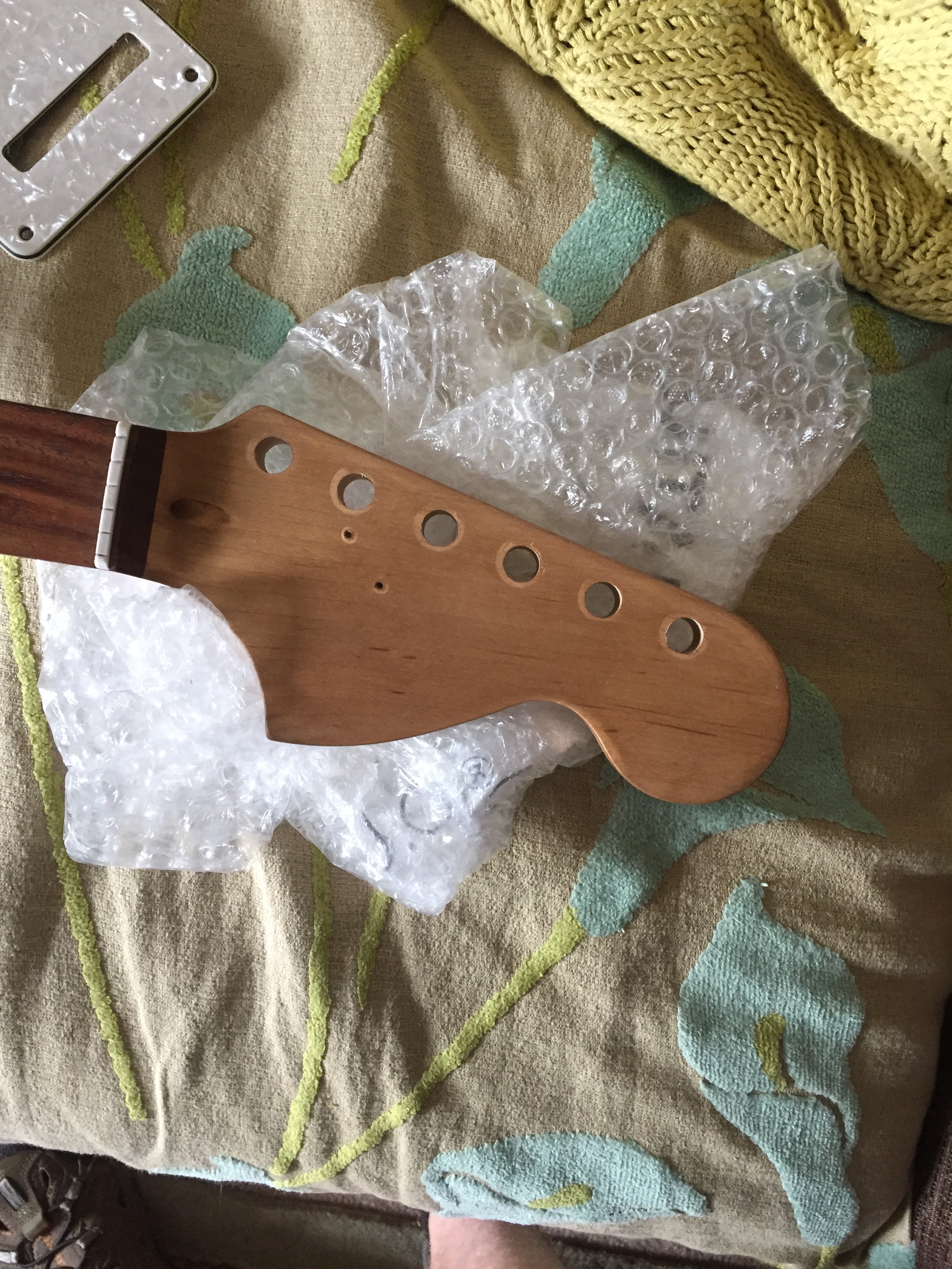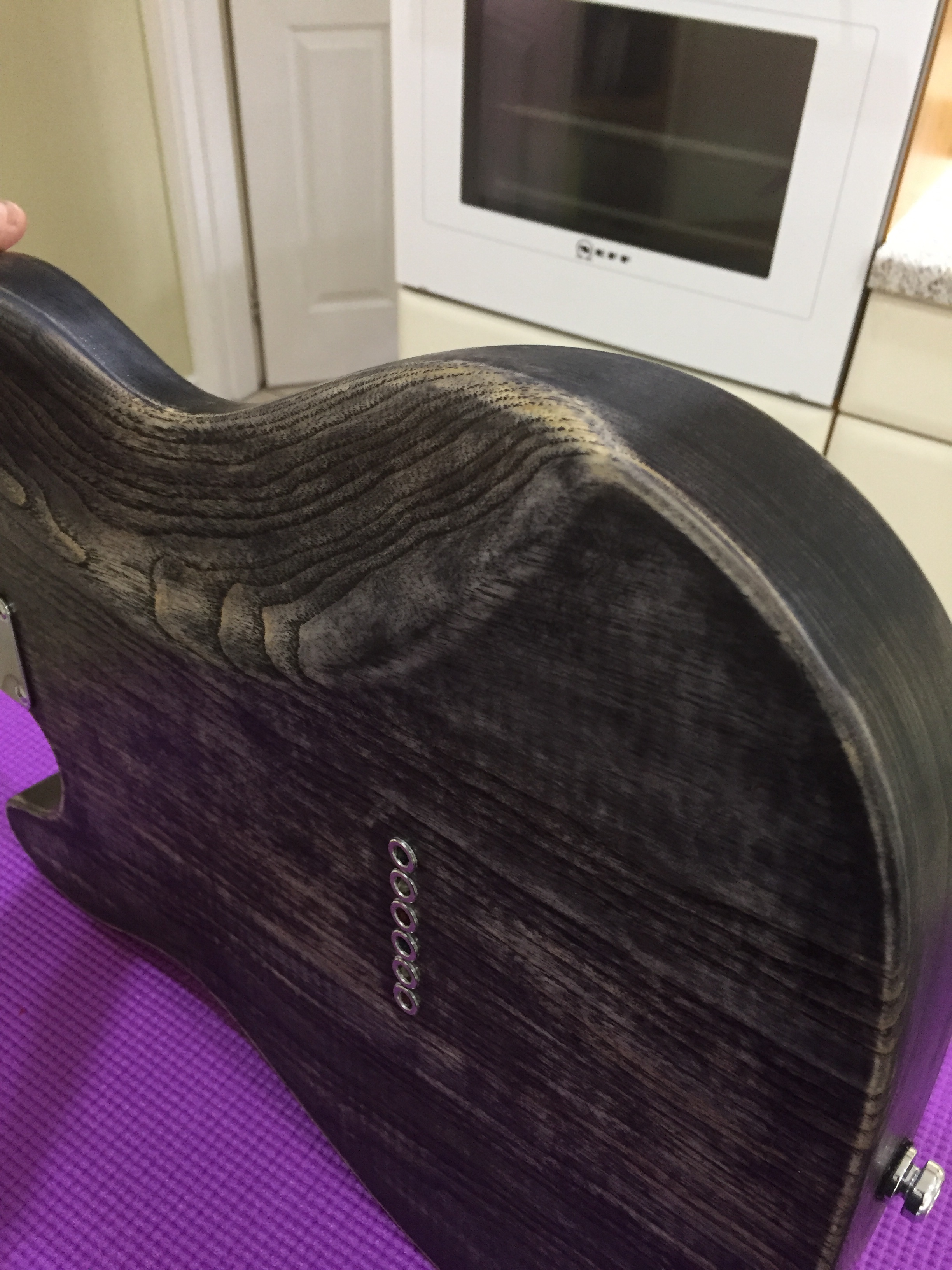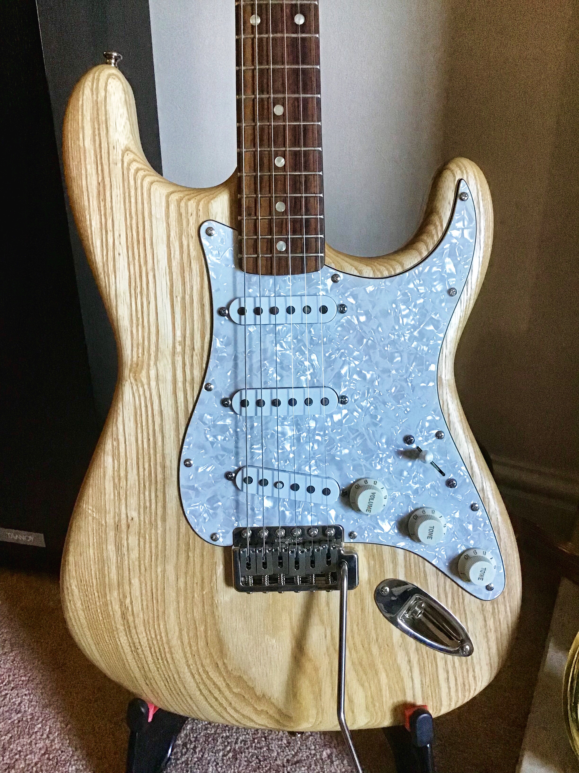 Built for my friend and musical compatriot KH; using Tonerider TRS3 Classic Blues pickups, a Wilkinson heavy bridge and Hipshot locking tuners. He has always liked plain ash bodied Strats and I thought a seventies style larger headstock fitted the look well. The guitar has both gritty bite and smooth bell tones from the neck pickup.