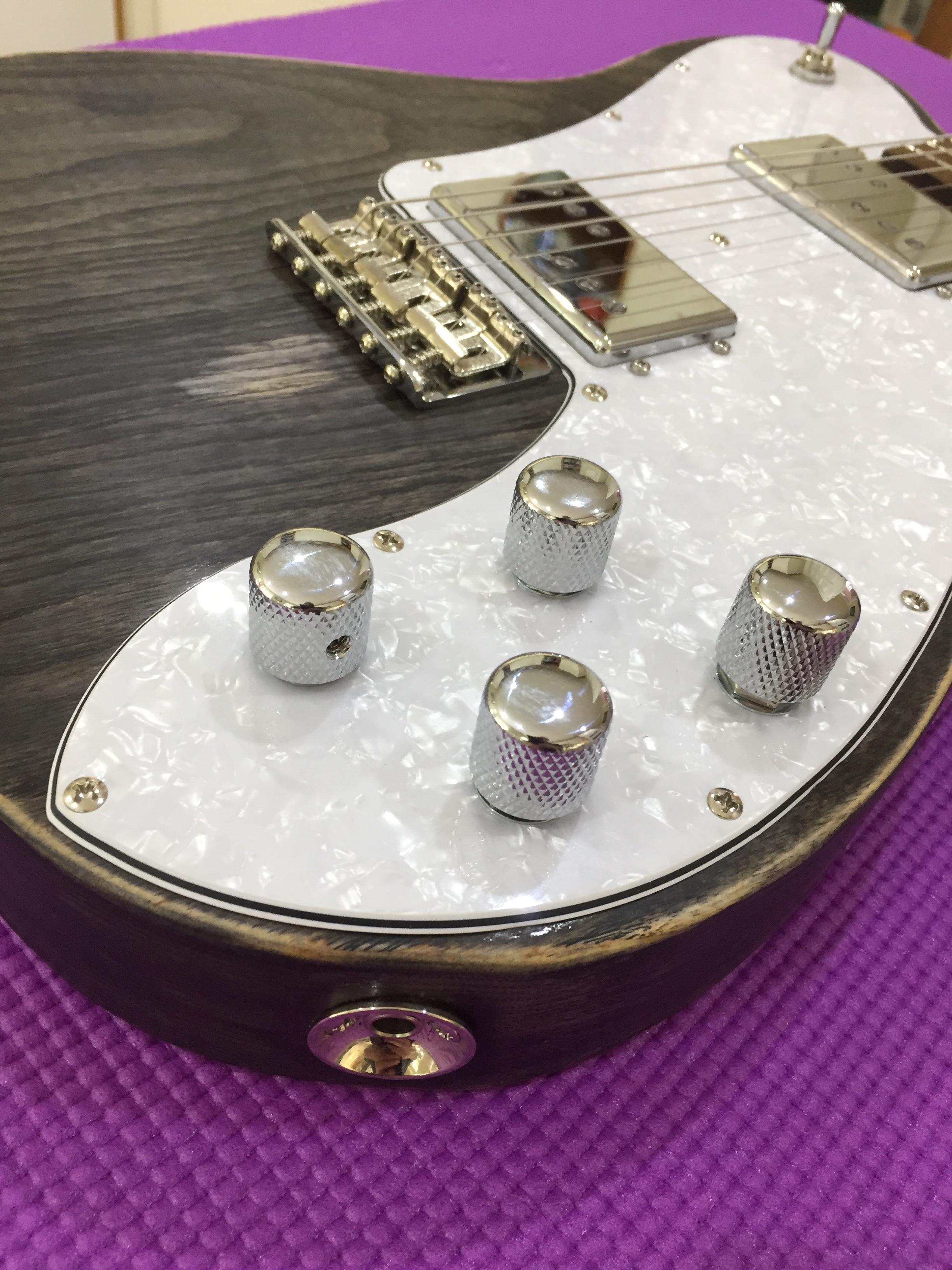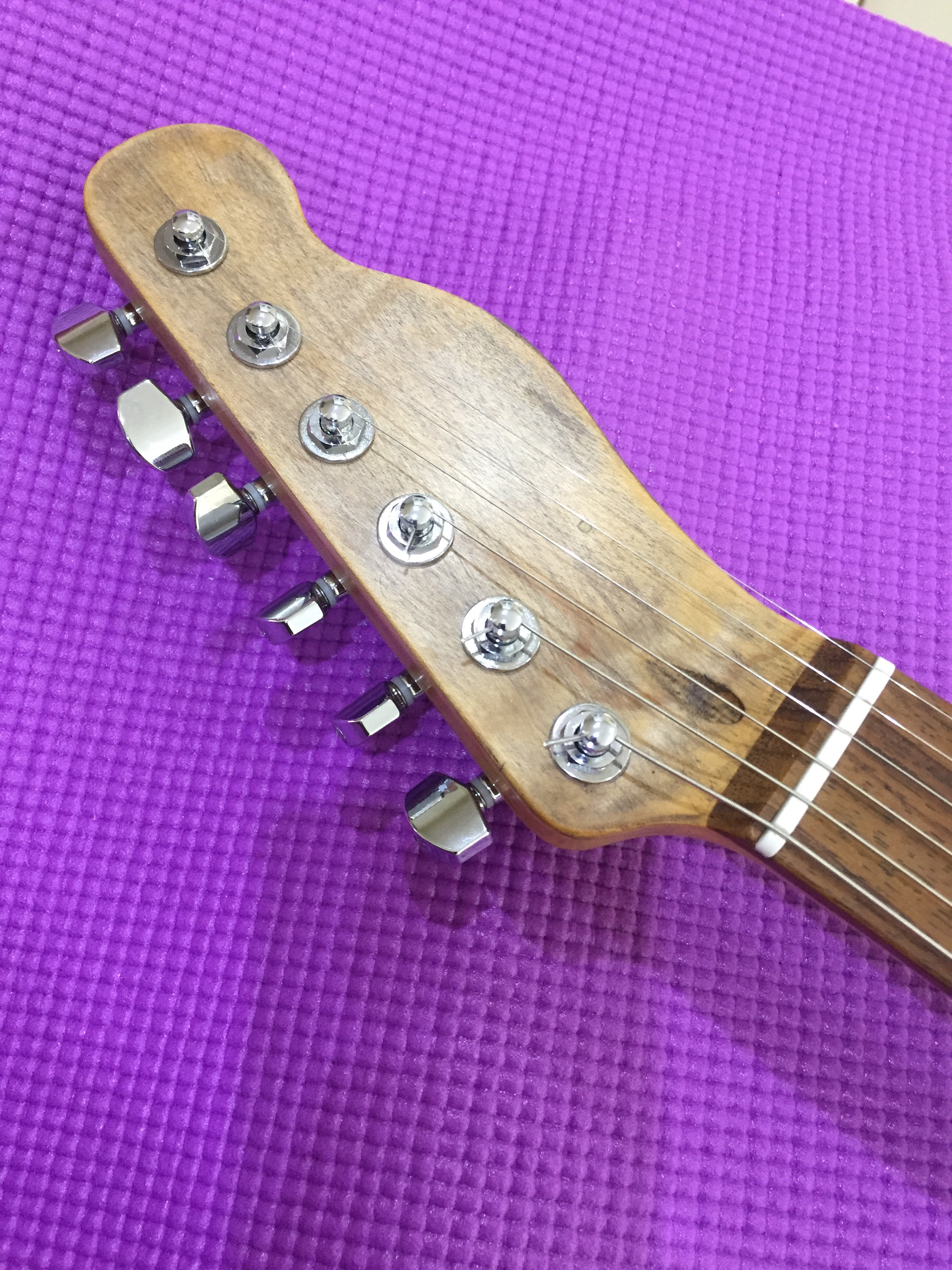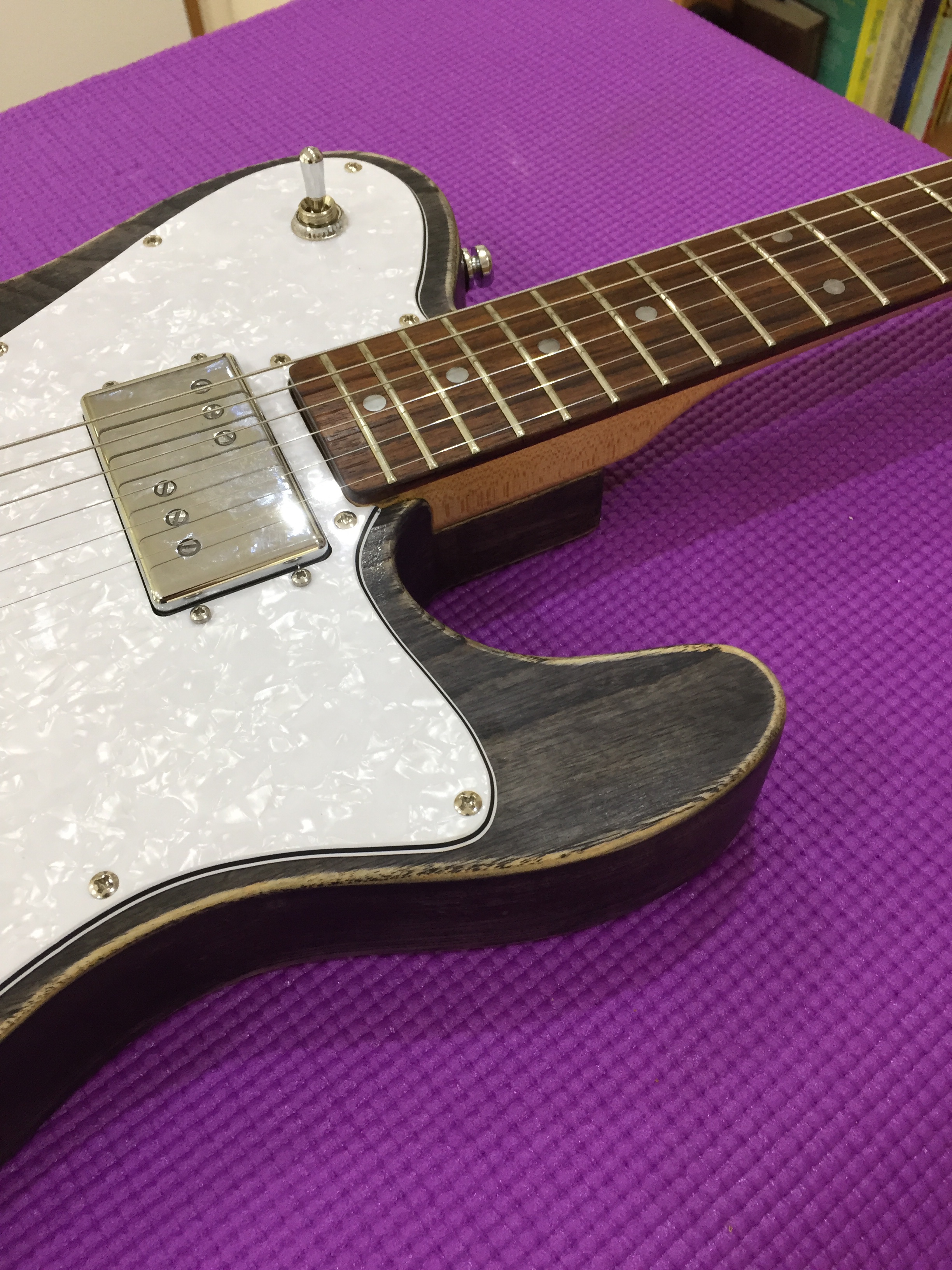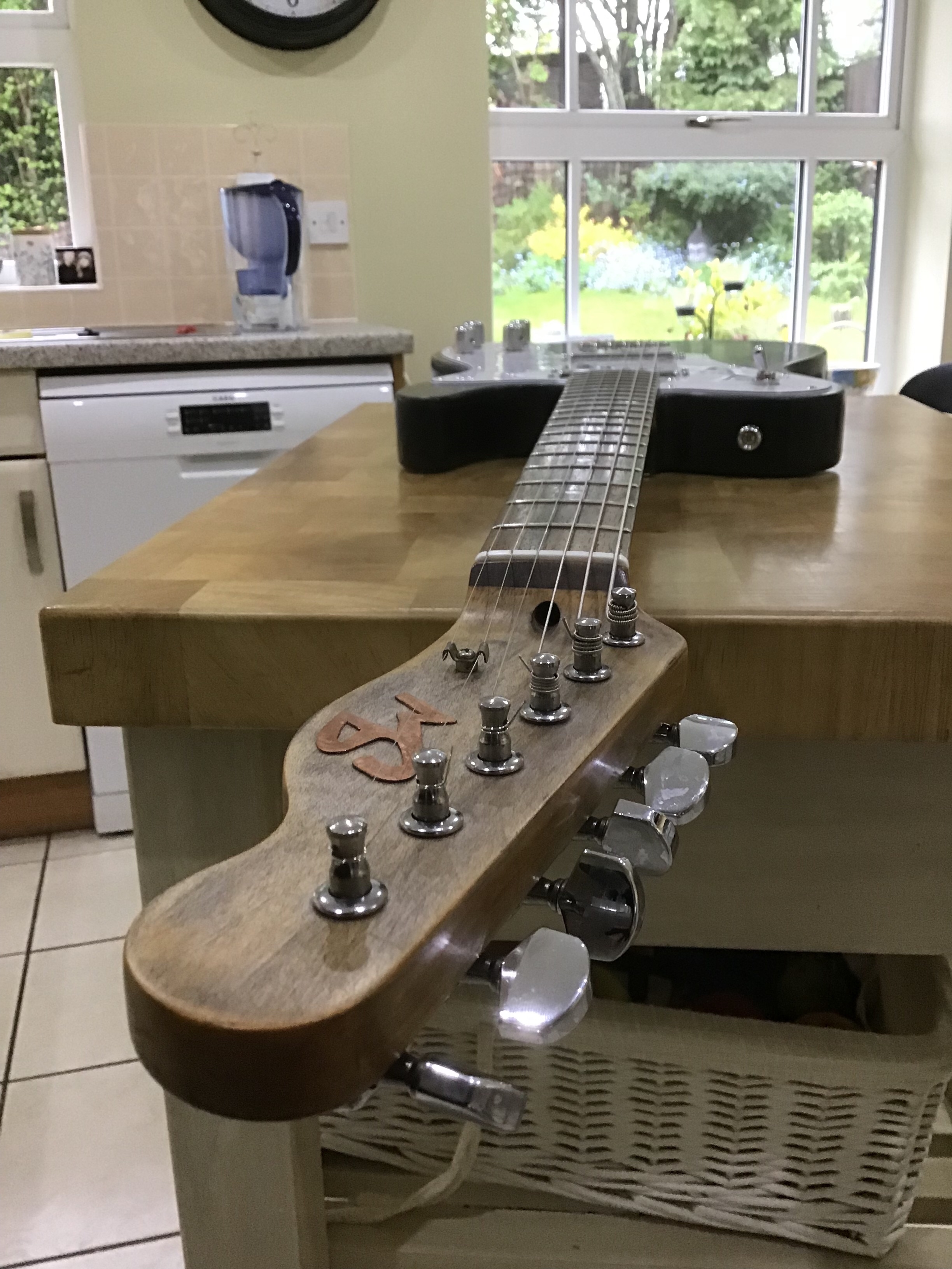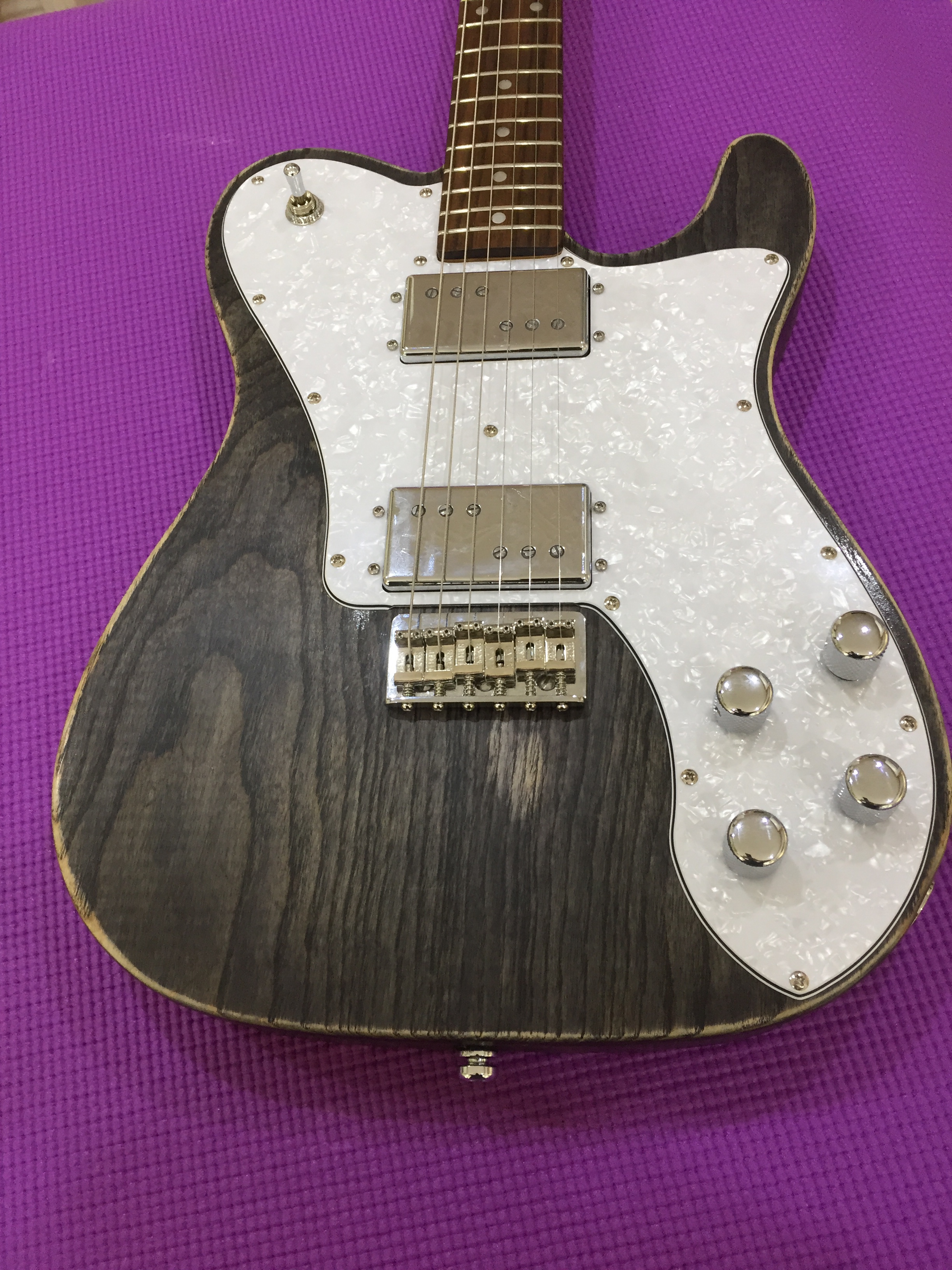 The Raven was my take on a Deluxe Telecaster. I chose a Telecaster style neck rather than the traditional Strat neck. A big thank you to Allan Price of Catswhisker Pickups who built me the pair of Widerange humbucker. As a note of comparison my friend has an original early seventies Telecaster Custom with a neck Wide range humbucker and the Catswhisker lose nothing to the Fender originals. Again I used the superlative Hipshot Locking tuners. I think the โ€˜barn-find’ finish looks even cooler in the flesh.